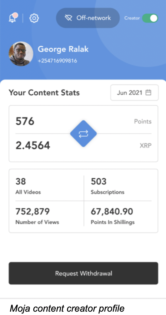 As the content creator’s Moja points from premium content are increasing, so is their value in XRP which is held in escrow until the content creator triggers a withdrawal request.