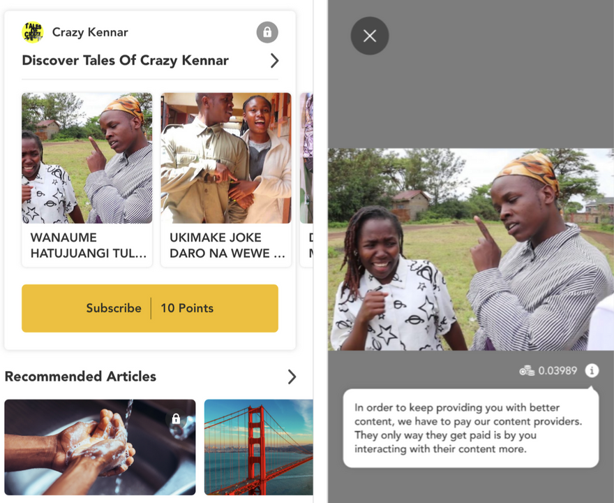 There is no shortage of vibrant and creative youth in Kenya who create content to further their art, raise awareness for social issues affecting them and hopefully, eke out a living. Unfortunately, local content creation is poorly monetized and therefore high value and relevant content is not created. Because a significant portion of the population is unbanked, they are not able to leverage the existing monetization platforms such as Youtube and low disposable income and relatively high costs for premium and paywalled content is not available to the majority of Africans.