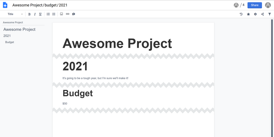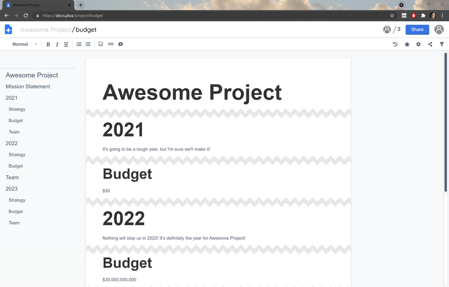 The document is still live and editable in this view, and the hierarchy is respected so you can see which budgets you're looking at. The fact that these exist at a legible URL means views are easy to share and collaborate on. You can even apply multiple filters at once, e.g. https://docs.plus/project/budget/2021