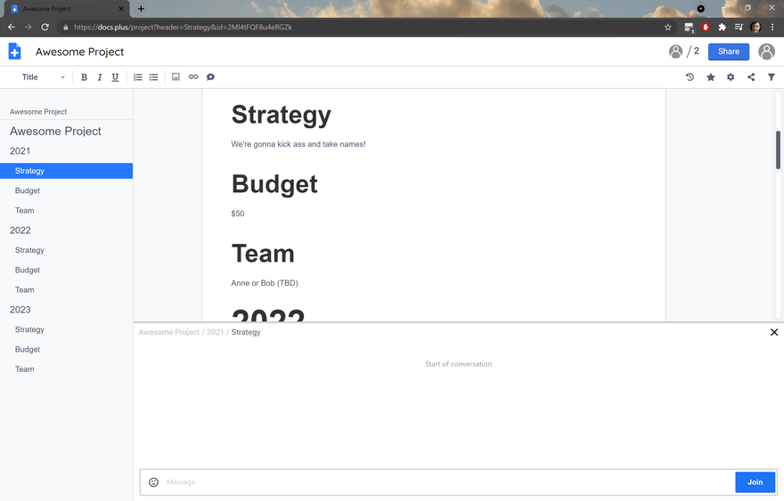 We think this "docs × slack" UX pattern is very intuitive and compelling. You can try a functional prototype at docs.plus/project; in the meantime, we're busy firming up the rest of the expected functionality - notifications, emoji reacts, mobile experience, everything you'd expect.