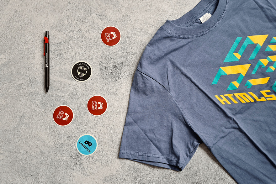 Ewa did the photoshoot of the js13kGames swag: new t-shirt, pen, and stickers.