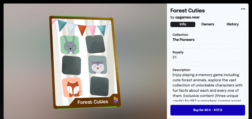Now, thanks to their efforts again, we can offer you a unique Forest Cuties NFT! It can be bought for 40 NEAR , and there’s only 60 tokens total - make sure to grab yours! You can support us, and in exchange the game will offer three in-game cards only for those who own the NFT.