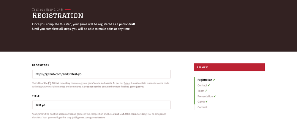Instead of the single-page, classic form asking you for everything at once you might’ve known since the very beginning in 2012, you can now easily start a draft, secure a unique name for your entry, test it on the voting app (which ultimately will become the new website), enter all the details, add team members, and submit when you’re ready.