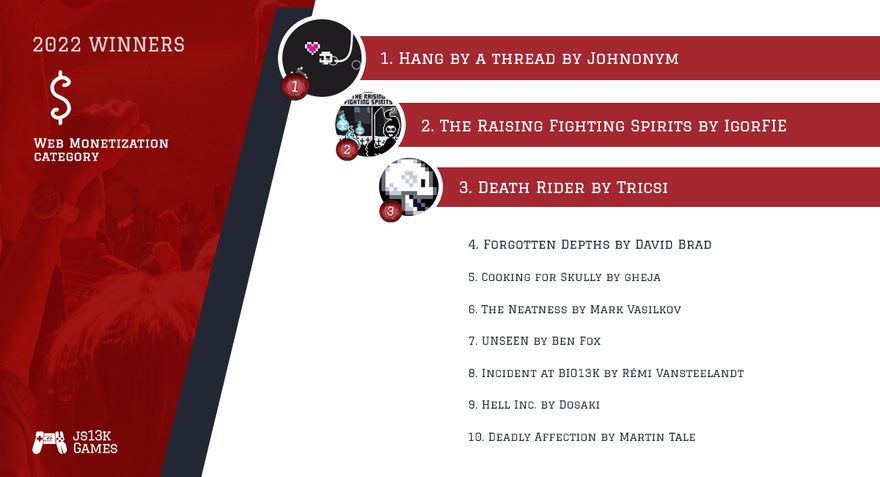 The fourth year of the Web Monetization category in the eleventh edition of the js13kGames competition brought us 21 awesome games out of 167 total - let’s have a closer look at the best ones, and see what the experts think about them.