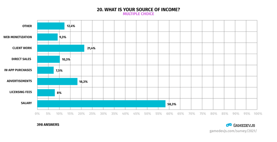 Gamedev.js Survey 2021 was a success as well, where we asked the community questions about various aspects of their development: from where they live, their work experience, what tools they use, to earning money, publishing, and even the overall happiness - a total of 26 questions.