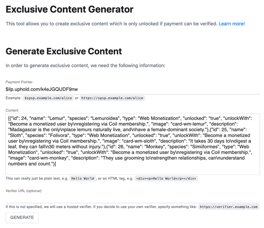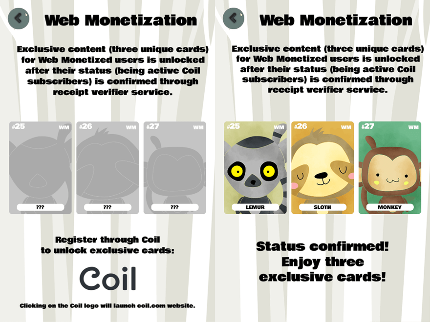 Forest Cuties game is using the receipt verifier service , so developers can see how exclusive content (in our case: three unique cards) can be secured and only unlocked after the actual verification if the player is actually monetized. This can be done entirely on the front-end side of things as the content can be encrypted and embedded in the index file, and the needed verifier to access can be a public one hosted at WebMonetization.org.