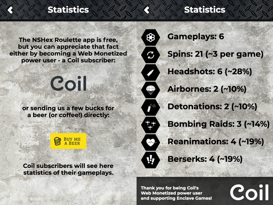 NSHex Roulette app is a free digital expansion to the physical board game Neuroshima Hex. As the first out of the three experiences experimenting with Web Monetization, we decided to start simple and offer unlocking the detailed usage statistics for Coil monetized users.