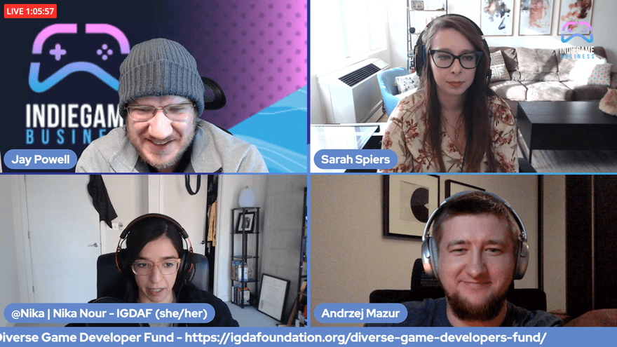 A few days ago, on Thursday March 4th, I’ve joined a session about the Diverse Game Developers Fund (started by IGDA Foundation and supported by the Grant for the Web program) at the Indie Game Business online conference.