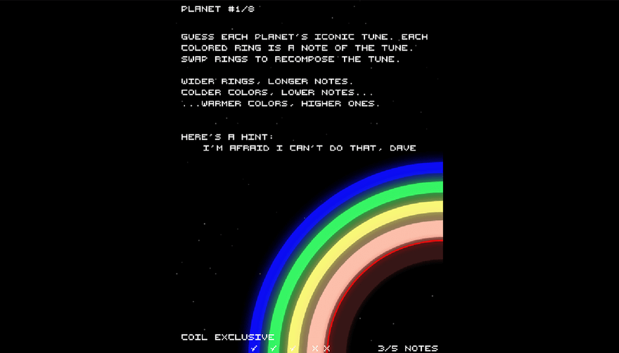 First place is 2021: a Space Opera where a player have to bring harmony to the Cosmic Microwave Background by solving each planet’s musical puzzle. Within the game, Coil subscribers get exclusive markers under each ring indicating if notes are correctly placed or not.