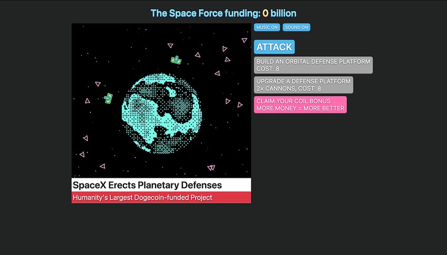 Third place is First Contact - the story of a first contact with an alien space fleet descending towards the Earth. Man the cannons, research upgrades, unleash the AI, ruin the global economy, rain fiery destruction upon the invaders. Coil integration offers in-game Dogecoins for quick start.