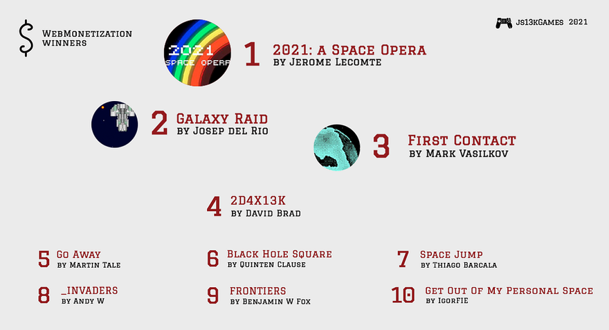 The list below contains this year’s top 10 entries, and we’ll be looking closer into top 5 games - keep in mind this ranking is entirely based on how well (in an original, creative way) Web Monetization API was implemented, not about the games themselves.