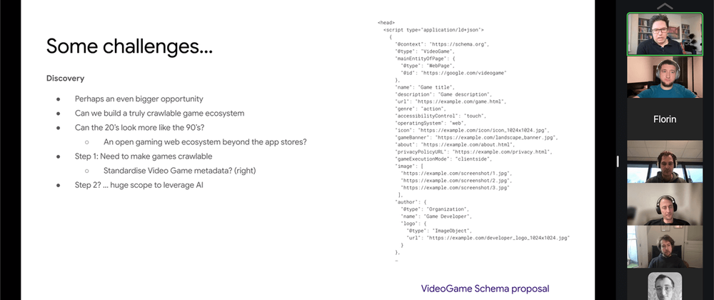 This was somewhat a follow-up to the discussion we had a few years back about Open Mini Games proposed by Tom Greenaway. At the recent meetup we had Andrew Gildfind from Google , a product manager for GameSnacks handling HTML5 ads for games, who was presenting about their platform. Tom Greenaway , AI and Games advocate at Google (and also W3C Games CG chair) was leading the discussion around the future of discovery, distribution, and monetisation.