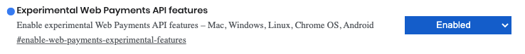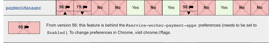 Another blocker for us was that we weren't sure if some of the experimental features that we were trying to build around were behind existing feature flags. Though we are able to use the PaymentManager feature specified in ServiceWorkerRegistration, the experimental flag #service-worker-payment-apps does not currently exist in-browser. However, a seemingly related flag is available: #enable-web-payments-experimental-features.