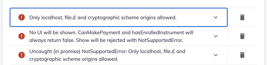 Quickly after this, however, we began encountering roadblocks. One of the main ones was that trying to construct a new PaymentRequest was not possible using our endpoint. Despite our payment method identifier being a valid URL, our extension threw the following error: