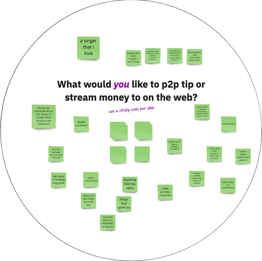 For the final part, we split up into groups to brainstorm different ways peer2peer learning could be enhanced with peer2peer payments. After some time working in smaller groups, people shared back to each other. Our discussion spanned many topics, including ideas for a kind of Universal Basic Income partly funded by Big Tech; questions on whether WM disincentivises dark practices like cookies, trackers & creepy recommendations; Micropayments for watching documentary films and ways to have enjoy how to videos without the ads.