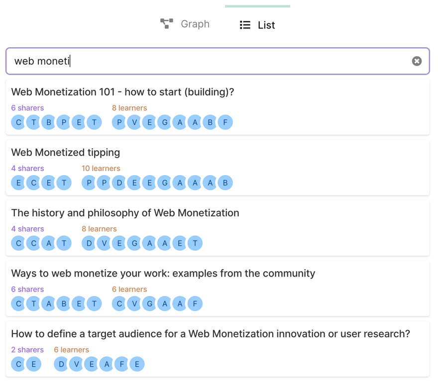 We've hosted two workshops around peer2peer learning in the Web Monetization community. The first was a session at Mozilla Festival early March and was titled Enhancing p2p learning with p2p payments. The second was the March GftW Community Call, where we gathered lots of input from community members and made meaningful connections based on shared interests (see the recording here).