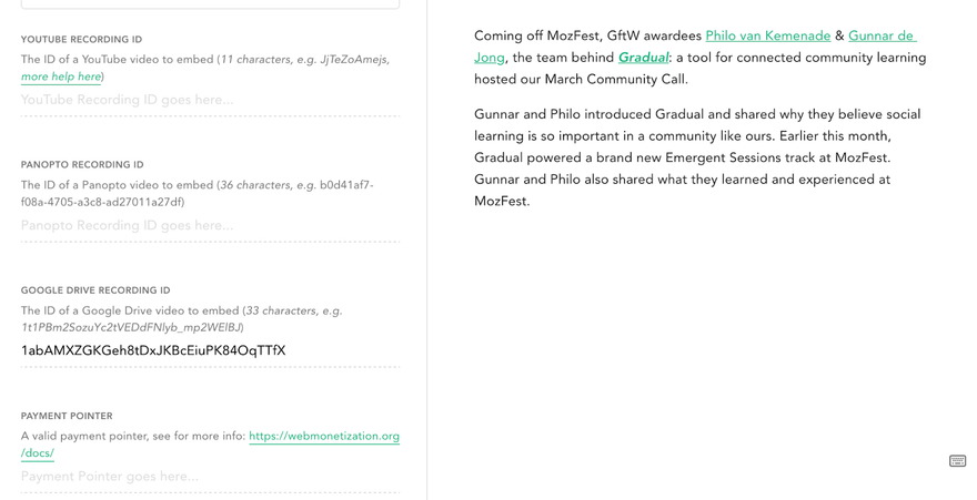 While our original proposal was to build in support for the web-monetized Cinnamon as a video hosting provider, we learned in our initial conversations with GftW staff that long term support would not be guaranteed and that Google Drive is used to store and share video recordings. We added support for video embeds from Google Drive to display session recordings on their respective session pages, along with the ability to easily add these videos via the Gradual CMS.