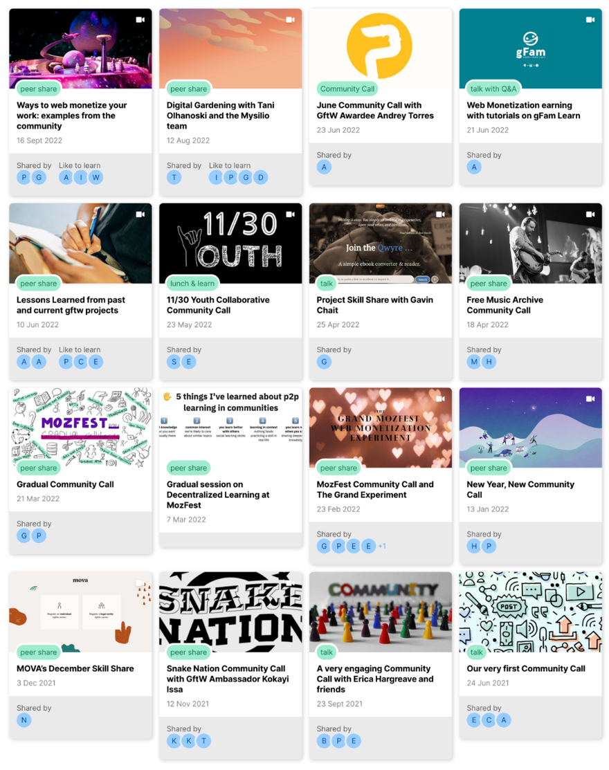 During the first months of the project, we’ve done important work to equip the current GftW cohort with tooling for peer2peer skill sharing. We launched a dedicated skill sharing space where community members share their how-how and learning intentions, from which matches with other members emerged. Since launch, we have released several improvements to the tool, more on that later.