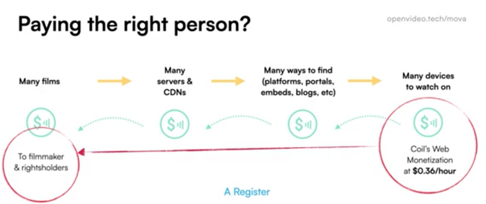 MOVA (Monetising Open Video Assets) discusses how they build on the Payment Pointer accounts at the heart of Web Monetization to register a video file with a pointer, and then distribute income received to it with the right people in the right order.