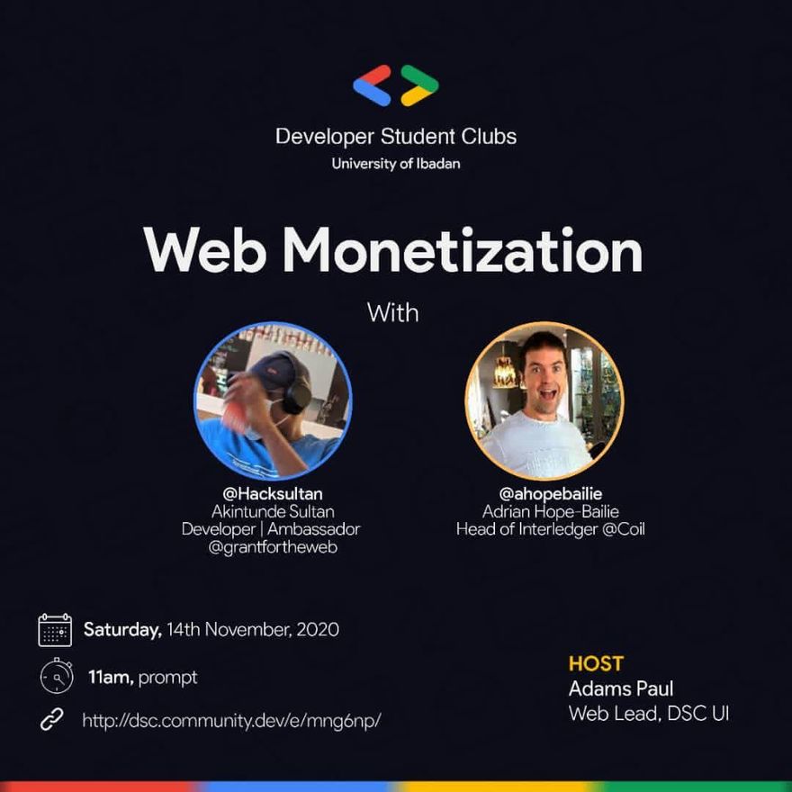 The developer student club in Ibadan, Oyo state, Nigeria is one of the latest student body in technology in Nigeria, we held a session to introduce students to the concept of web monetization, both as a means to generate revenue and also opening their eyes to the difference between web monetization and other models such as ads and subscription based model.