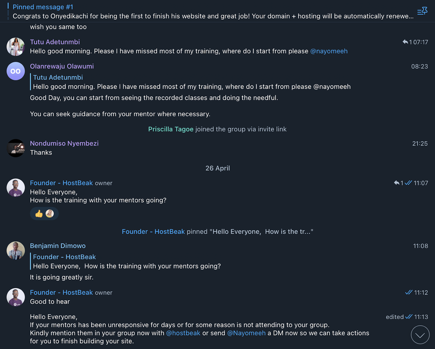 Some complained they didn’t get support from Mentors as others did after the programme. We realized they were only sending the mentors private messages and didn’t speak up, reach out to us or inform us publicly as we instructed them to. We had to personally attend to them the best way we could.
