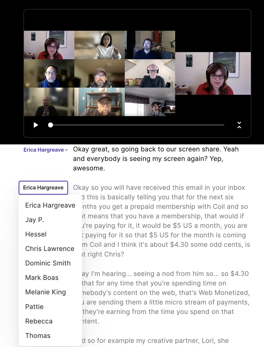 We can reference speaker data to know when to switch Payment Pointers, while people watch and interact with the video. The idea being that speakers will be compensated according to how much the part of the video they feature in, is viewed.