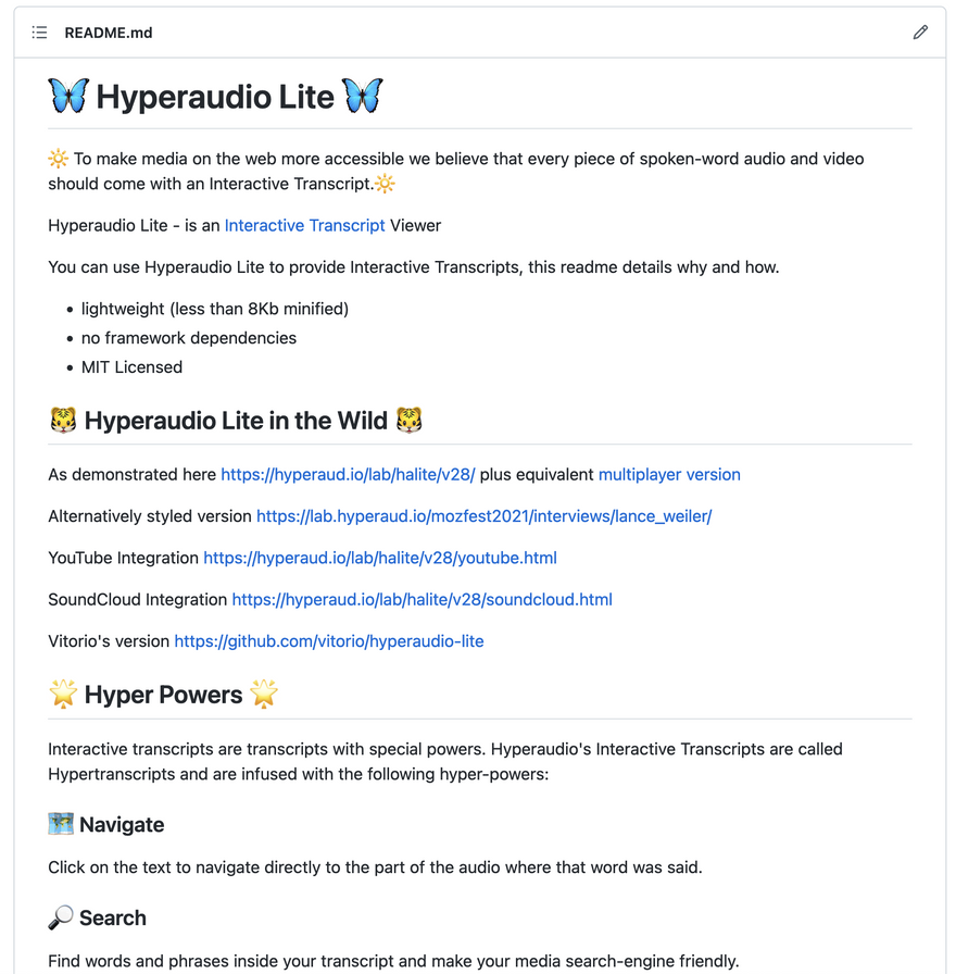 Hyperaudio Lite is a lightweight JavaScript library that allows developers to create and customise Interactive Transcripts, which in turn makes up the core of the Wordpress Plugin making it easy for non-developers to do the same.