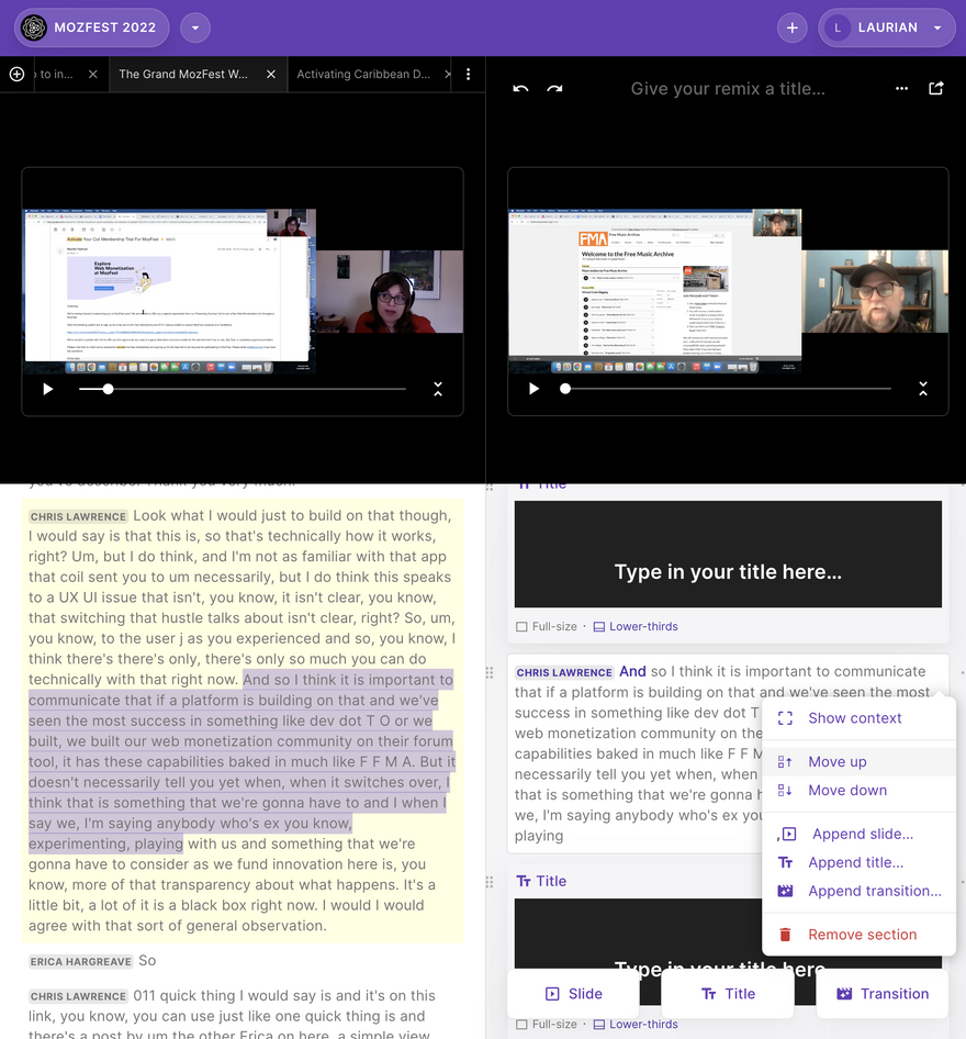 The Remixer holds a lot of promise for repurposing content. It allows people to construct new videos just by moving text around, and so it's a very intuitive content-based way to assemble new forms.