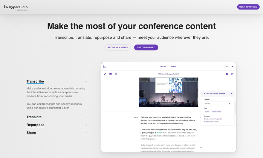 Hyperaudio for Conferences is a platform that aims to maximise the accessibility of conference content, while opening up new possibilities to repurpose that content.