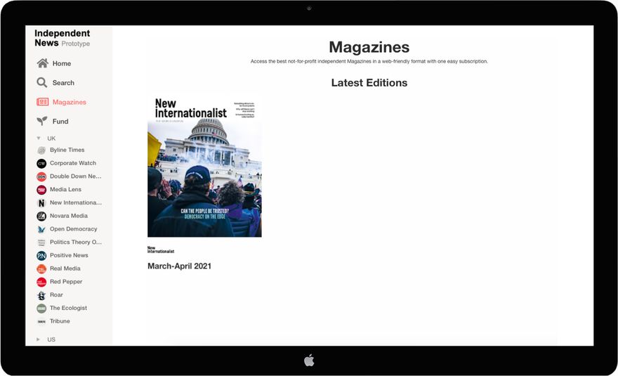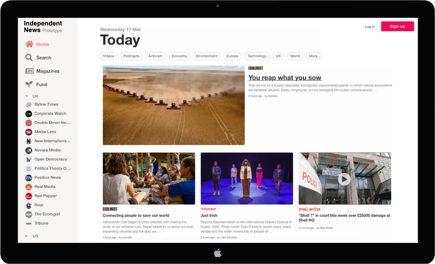 Our idea was to create a basic prototype for a web monetised news aggregator - a site that streams content from multiple sources into one place for easy viewing, like the google or apple news app, but without any advertising, data tracking and exclusively for independent media. This way users can: