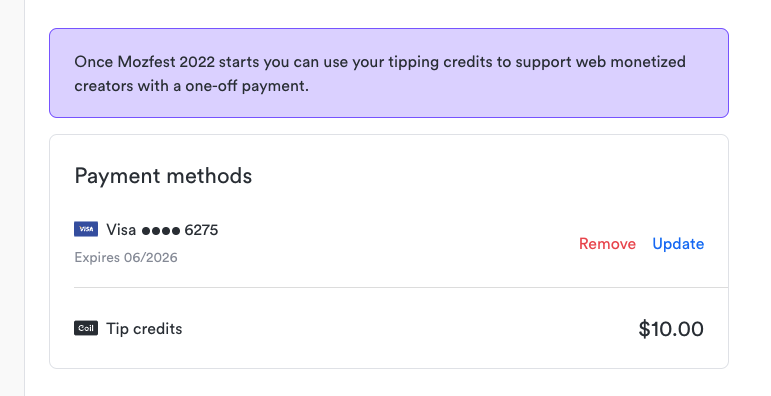 We know the Web Monetization community has been waiting an opportunity to experiment with new Web Monetization features. Finally, we have our chance! In partnership with Mozilla and Coil, we are excited to host a MozFest-wide experiment in tipping!