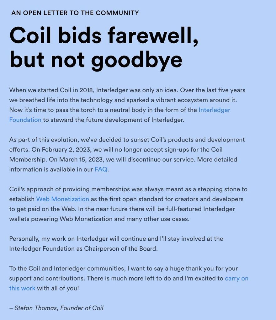 Never would've tought hearing this from Coil team. They are holding much of the foundation and infastructure Web Monetization has today. The Web Monetization community is direly in need someone else to pass the torch to fill the void in WM Provider space Coil left behind.