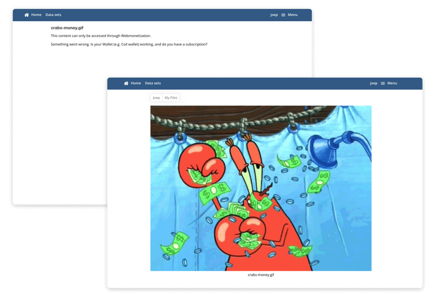 We've added WebMonetization to this application, too. In the DexPod, users can upload files, and optionally add a PaymentPointer to them if they want to monetize that content. Similar to how this works in Atomic-Server, access is only given when a payment is succesful, and otherwise users will be shown instructions on how to get a wallet installed.