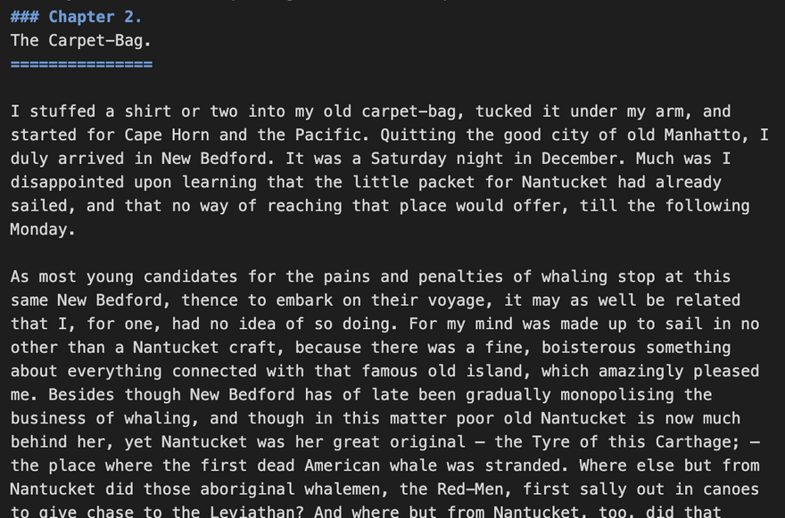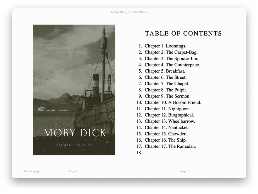 Authors have their own ideas about what constitutes a chapter, and what should be included in a Table of Contents. In the sample book being used – Moby Dick – the author of the markdown files used a combination of <h3>for a hat and <h1>for the chapter title. Meaning that to assemble a working label for the Table of Contents, LWP needs to find the first <h3>in the HTML and then look for the <h1> that immediately follows it. Once LWP has all this information, it can render a nice Table of Contents that looks like: