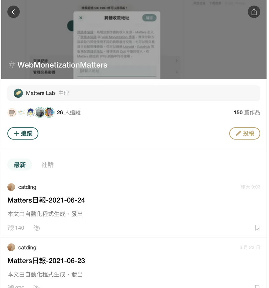 As a user generated content platform, we not only communicated about Web Monetization by publishing content ourselves, but also by encourage users to write about Web Monetization. Users on Matters have written about the mechanisms, mental model and applications of Web Monetization, as well as novel ideas on general content monetization shemes.