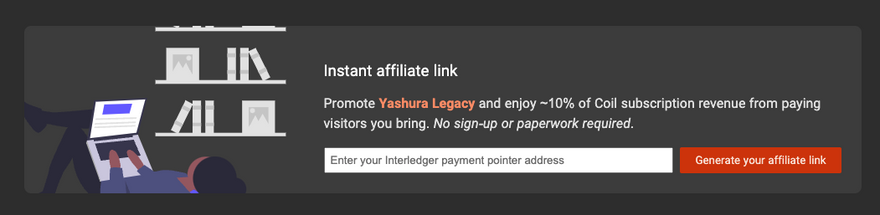 https://example.com/my-novel, then I'd need to output a link that generate something likehttps://example.com/my-novel?affiliate=%24wallet.com%2Fexample, which will point out to$wallet.com/examplea user generate on the UI above. At this point there shouldn't be a need to use Webfunding.js since vanilla JS is already more than enough to generate query string on URL. However, to store the payment pointer and use it for future payment there's a need to runnew WebMonetization().registerDynamicRevshare("my-novel-title", "10%").start()from Webfunding.js inhttps://example.com/my-noveland any other relevant pages.This is the most straightforward implementation I thought of at the moment since there will little to no set up previous to installing Webfunding.js through NPM to use the feature (or put script tag from CDN and use directly without JS bundlers). I haven't thought of affiliate "terms and rules" or any other details like more persistent database than IndexedDB, but since this is only an experiment for me I'm plenty satisfied with my progress currently.