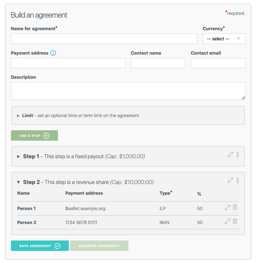 Each step in an RSL agreement pays out either fixed amounts or a percentage split - before flowing onto the next step. Steps could have one payee or hundreds; and each payee can be identified with an ILP payment pointer (or a bank account, wallet address or other payee address). RSL isn't intended to generate or implement the agreements β that's the next task in our project β but rather to provide an open serialisable basis for structuring them.