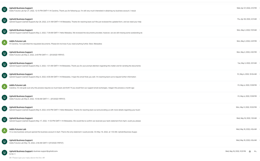 Screenshots from the many correspondences with Uphold Business Customer Support