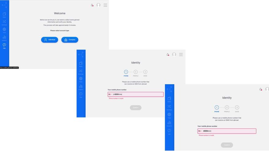 As you can see in these screenshots, you can’t even click the “Help” button without first verifying your phone number. In this image from my GateHub experience you can see where I used two different functioning US numbers, in different formats, but the system continued to reject them as ”invalid”. This type of all-or-nothing on-boarding UI presents a very frustrating “brick wall” for new users and is a significant deterrent to mass ILP web monetization adoption. We're a fairly tech savvy team and can only imagine what a turn-off this would be to someone more novice.