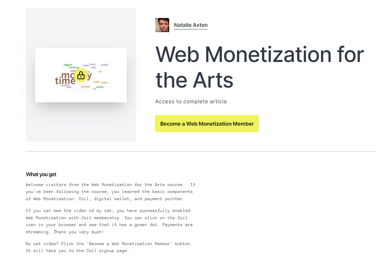 Matt Mankins and I are the co-founders of Monetized, a tool for creators to sell and paywall online content. Monetized allows users to gate content using Web Monetization. I created a page on Monetized for those following our course to test their skills. If they had become Web Monetization members through Coil, they would be allowed to see the page I created on Monetized. If they had not, they would be directed to Coil in order to become members.