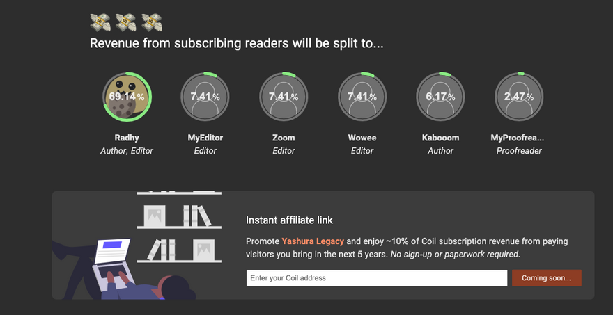 Since the start of ProgNovel, revenue share with Web Monetization has been one of the main feature of ProgNovel - which, additionally, has been expanded and explored to ProgNovel's experimental affiliate marketing system (which soon will be receiving a design overhaul!). As the star feature of ProgNovel, revshare is getting a little love, with the emerging revshare stats that will be the main focus of an UI that readers, creators, and contributors to check how revenue from Web Monetization API will be distributed.