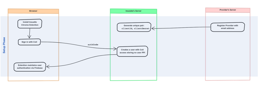 I built a Chrome extension that will allow a Sign-in with Coil, providing Project Insulate the credential access without releasing any personal identification information (PII). It also creates a user on the Insulate platform using a custom identifiable token on Firebase and keeps the user logged in the extension. Also, the provider (the one providing exclusive data) can easily register with Insulate with an email address to receive a clientId and corresponding clientSecret.