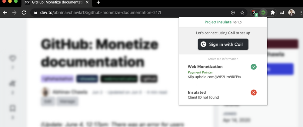 Looking at the diagram, you will notice that the Insulate extension will look for two particular tags on every webpage: monetization and insulateId. The provider needs to add the clientId they received in the base setup step as the insulateId meta tag on their webpage. If both the meta tags are found, the extension automatically sends a request to the Insulate backend (protected by Firebase user credentials) which indeed verifies the subscription on the Coil account for the user.