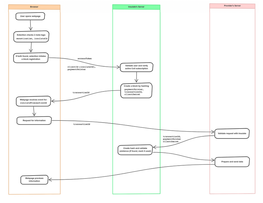 When a user opens a webpage, the Insulate Chrome Extension will automatically update the Insulate backend which in turn will verify an active subscription on the Coil account at that very moment. When the webpage makes the open call to the provider's backend to fetch data, the provider can now check-in with the Insulate backend to verify whether to allow access to the user or not.