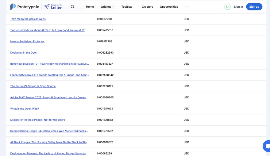 Through open sourcing the Prototypr platform, and making it paywall-free and content accessible to all, we have created a growing open space that is not controlled by a 3rd party platform. However, despite being in our own space, we still have to compete with larger platforms that offer higher payouts than Web Monetization: