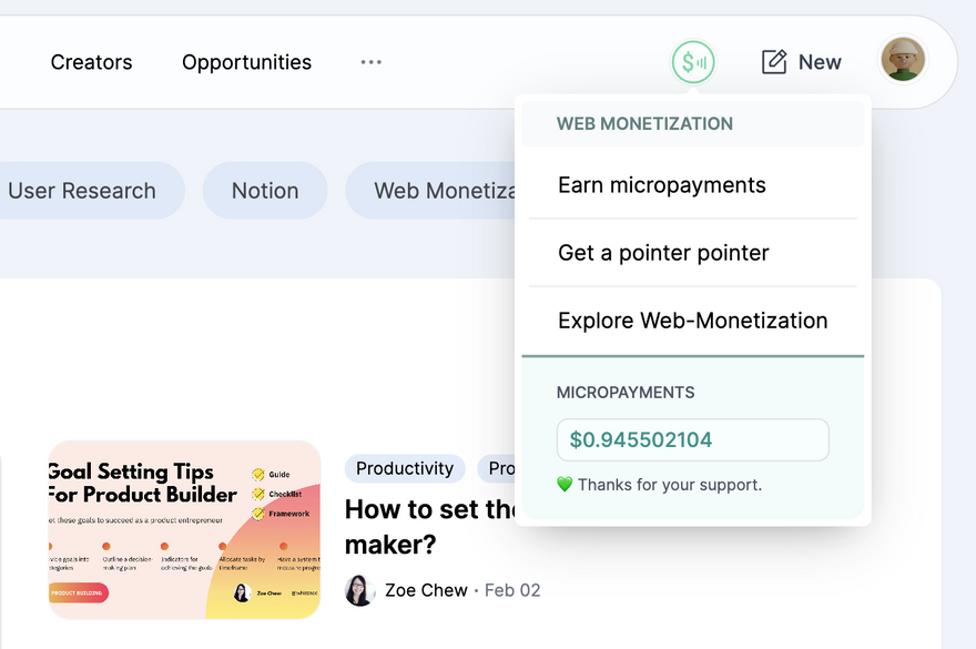Until more payment providers emerge, I think Web Monetization has helped a lot in exploring what's needed for a fairer and open web to happen. Implementing the payment pointers and Web-monetization made me realise that people really want something in return for being an active Web-monetization user. Enabling writers to earn micropayments, and 'contributing to an open web' didn't seem to be a big enough incentive.