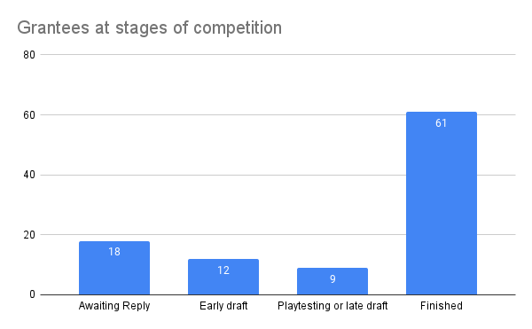 Details: All microgrants have been approved and disbursed. Our team is still available to help grantees who have questions and are still working to complete their games. See below for two charts showing the composition of the micrograntees and their current progress toward finishing their games.