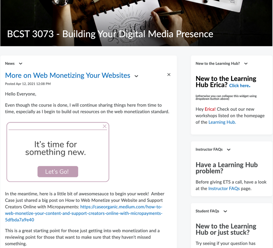 - Develop some teaser content in BCST 3073 - Building Your Digital Media Presence to the web monetization standard on the course home feed and in the feedback to students on their assignments and in a closing email on the course. More formal content on the web monetization standard will be added to the main body of the course in the Autumn offering of the course.