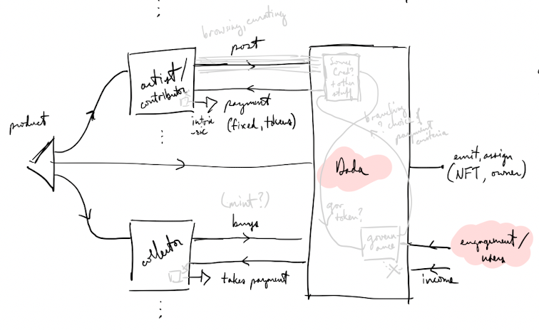 We’ve made good progress on the first goal, and are in the middle of implementing the prototype. But there’s a lot more to do before we can deploy Metagov with live users on our "launch partner", DADA.art. In the meantime, we’ve built a series of architecture diagrams with DADA that explore the different kinds of institutional structures and governance systems that we might implement using Metagov and its associated tools.