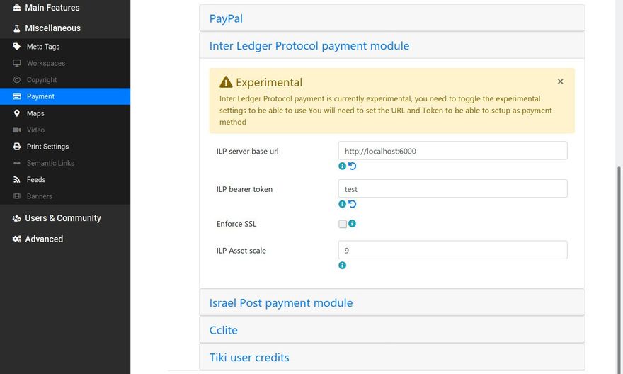 The first objective was to make Tiki fully compatible with ILP for sending and receiving payments, and with Coil for web monetization. Integration with ILP was more difficult than expected, but we found a way to succeed. This will be described in more detail in the next section. Also, as mentioned in our previous progress report, the integration with Coil has been completed. The team has implemented a new administration panel preference to activate monetization of an entire Tiki website, and a wiki plugin (a kind of macro placed in wiki text) named "Plugin Coil" enables monetization of specific content. With this feature, Tiki is capable of efficiently and easily enabling monetization of a complete website or selected contents of the website.